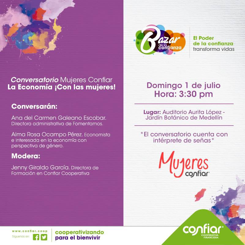 Y como la economía solidaria es un eje fundamental que nos une y nos convoca, se realizará el conversatorio La economía, ¡con las mujeres!, donde nos acompañarán Ana del Carmen Galeano Escobar, directora administrativa de la Corporación Fomentamos y Alma Rosa Ocampo Pérez, economista interesada en la economía con perspectiva de género. Esta conversación tendrá lugar el domingo 1 de julio a las 3:30 p.m. en el auditorio Aurita López del Jardín Botánico y cuenta con intérprete de señas.